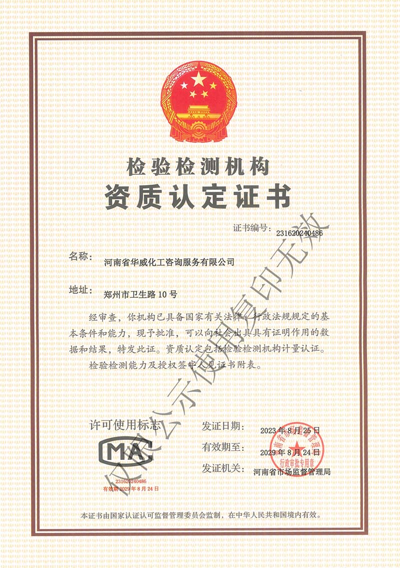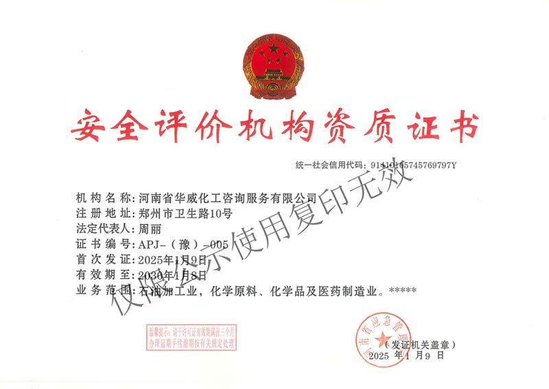 河南省华威化工咨询服务有限公司成立于2002年12月25日,公司具有固定办公场所,注册地点位于郑州市卫生路10号,注册资金500万元,固定资产1300万元,是一家具有独立法人资格的股份制企业。公司现有办公面积约2000㎡,档案室面积150㎡,是集安全评价、安全生产标准化评审、油气回收检测、职业卫生检测、HAZOP分析及安全咨询服务为一体的综合性技术服务机构。公司具有国家认可并由河南省安全生产监督管理局颁发的安全评价机构乙级资质证书,河南省化工医药安全生产协会理事单位,...